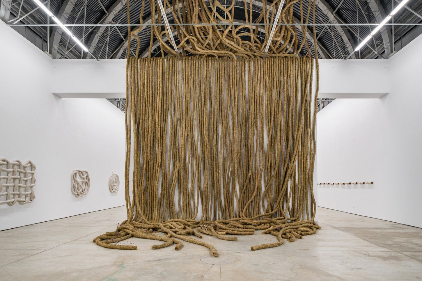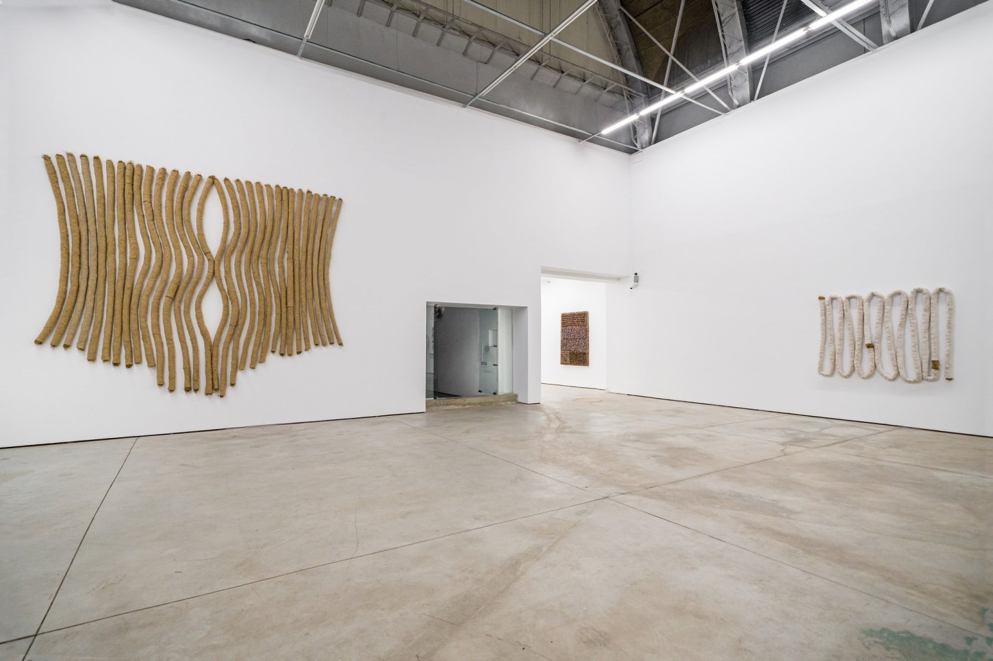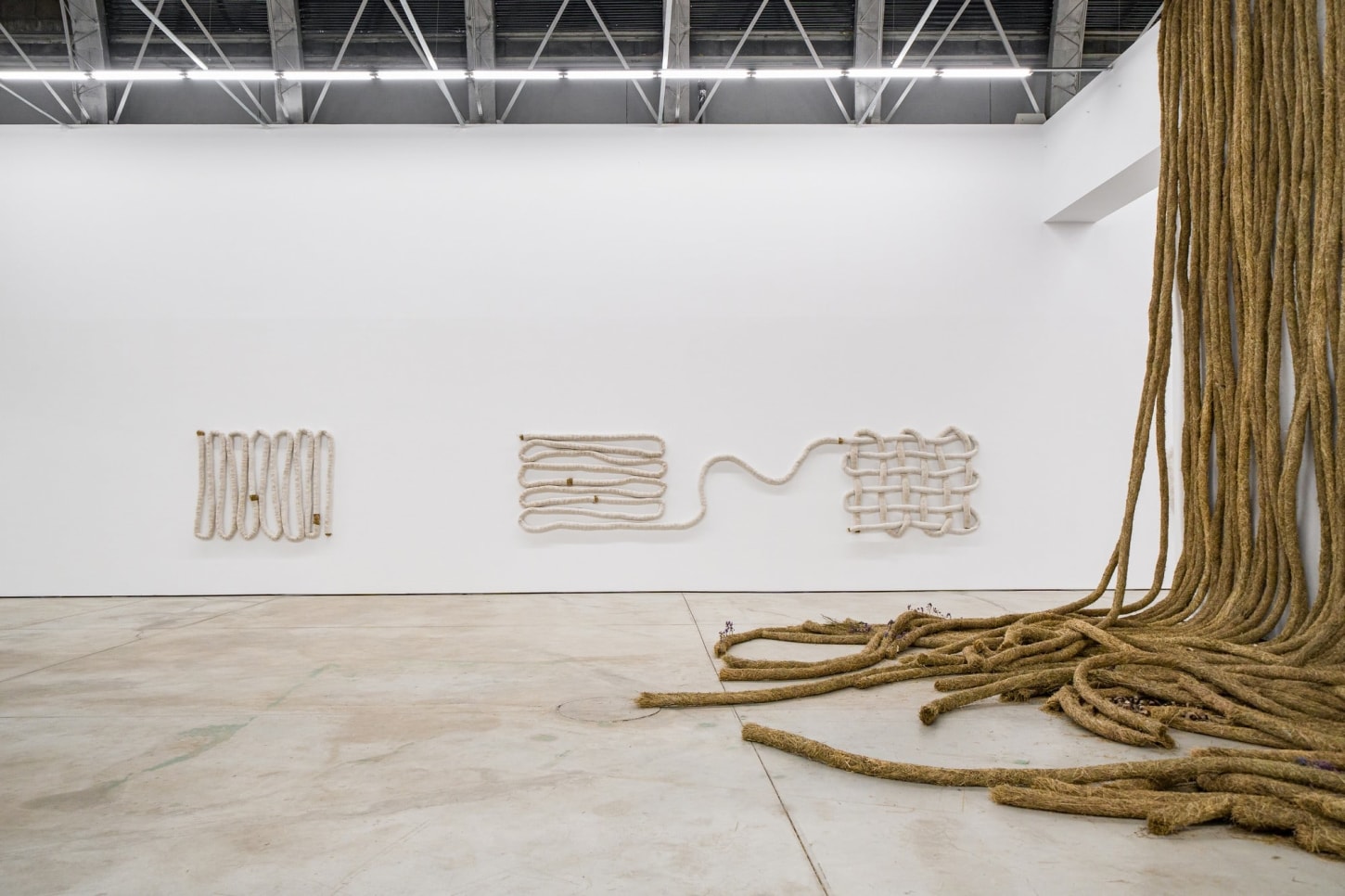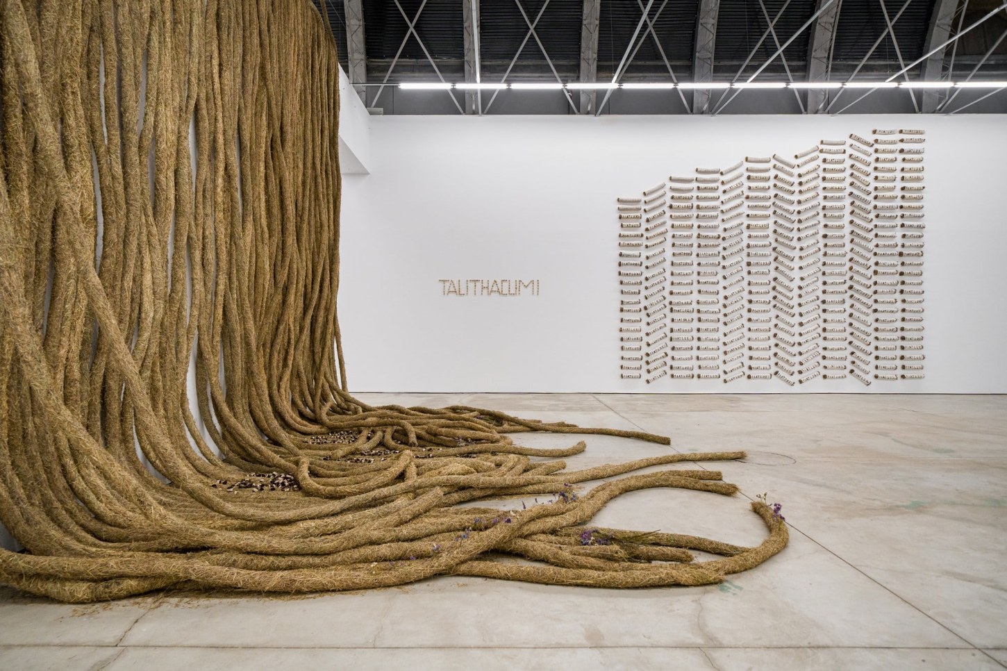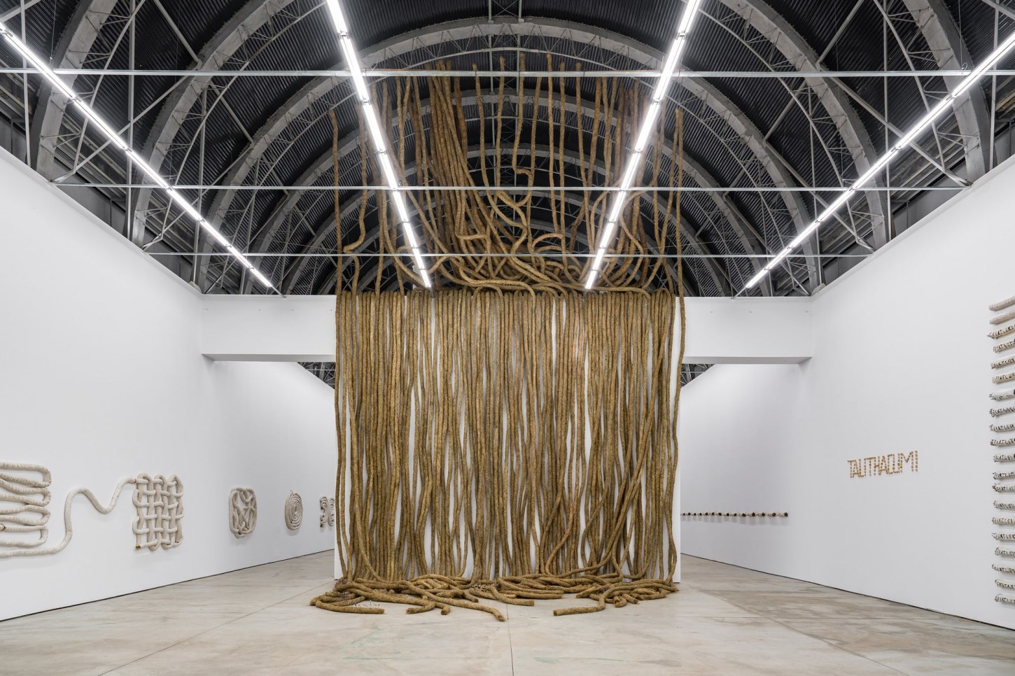 The installation unfolds as a living organism. Towering columns of hay—some over seven meters—rise through the space, acting as conduits of energy, while others are braided into sculptural forms. Herbs release delicate scents; inscribed words echo like mantras. The contrast between the white of handwoven cloth and the darker tones of hay underscores the visual and haptic power of juxtaposed textures and varying thicknesses of weave. Structure, weight, and rhythm emerge from meticulous control of materials, producing a poise and archetypal beauty that govern the space.