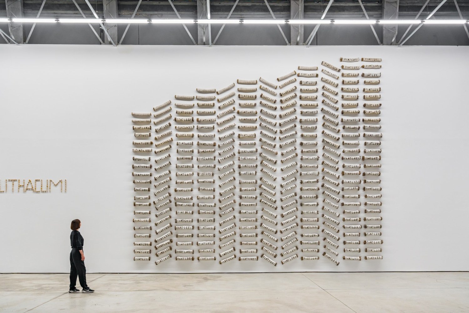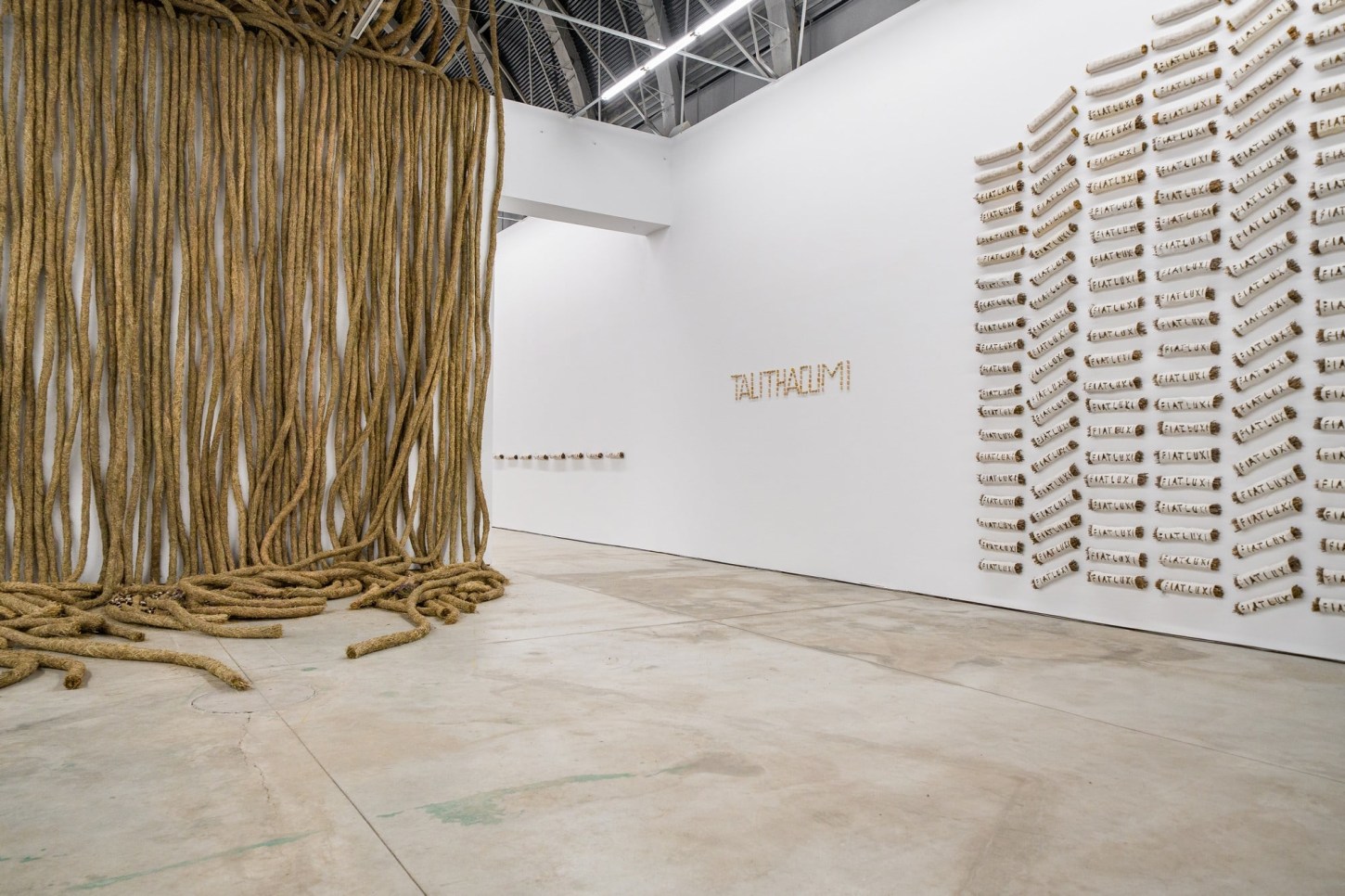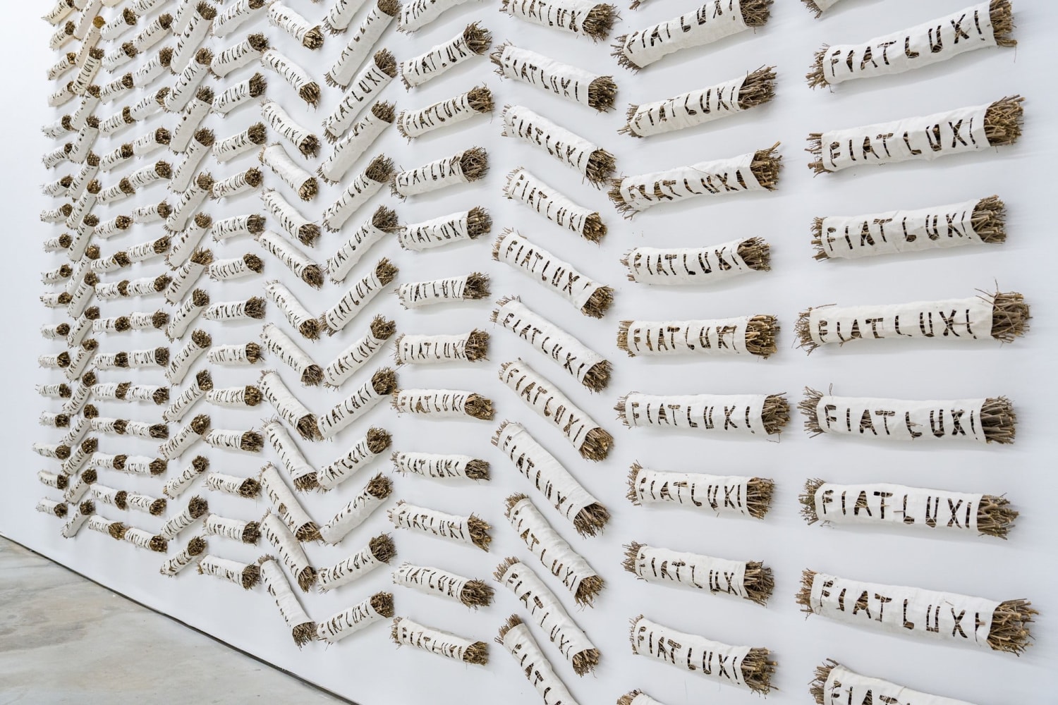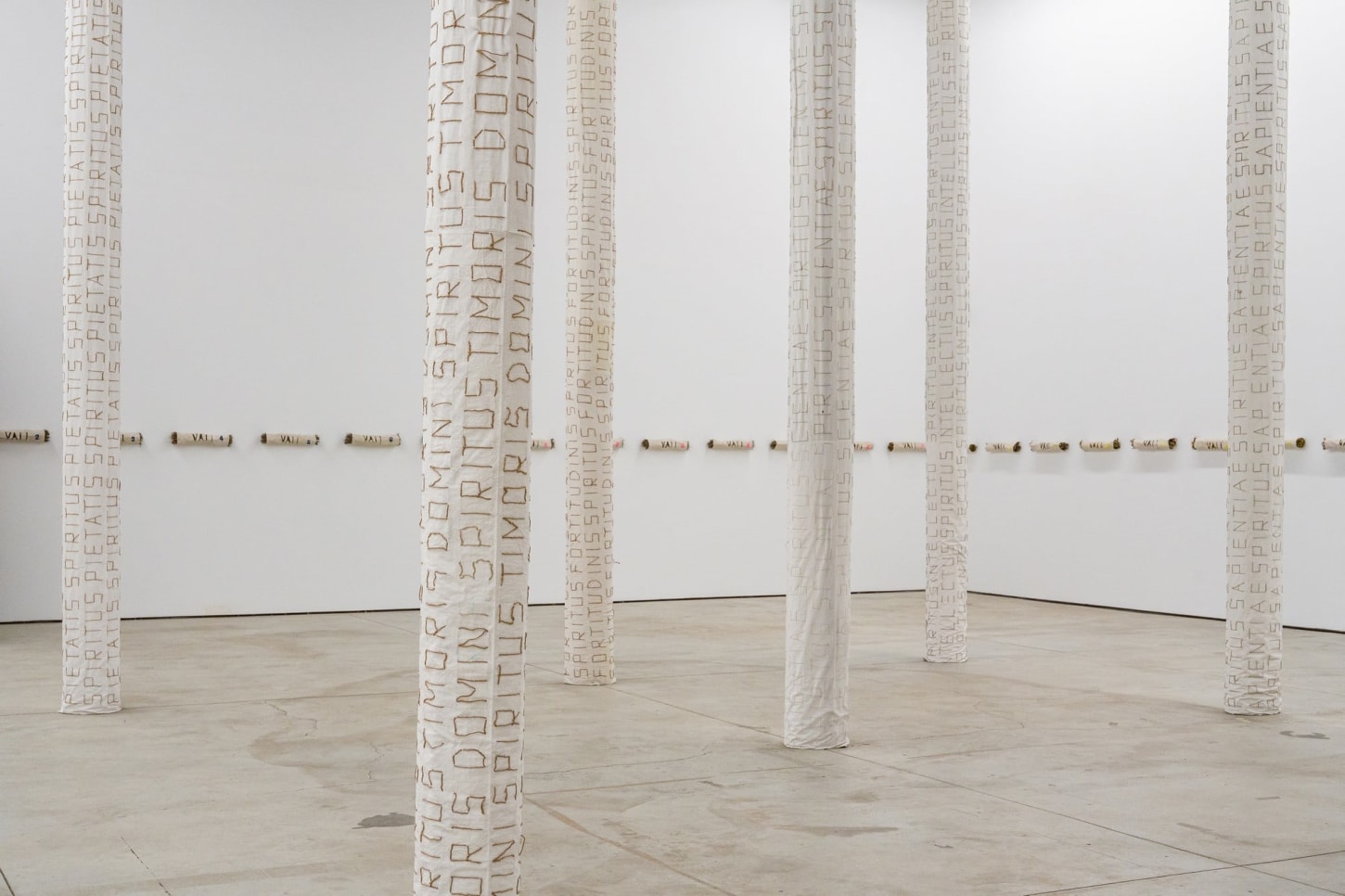 The installation unfolds as a living organism. Towering columns of hay—some over seven meters—rise through the space, acting as conduits of energy, while others are braided into sculptural forms. Herbs release delicate scents; inscribed words echo like mantras. The contrast between the white of handwoven cloth and the darker tones of hay underscores the visual and haptic power of juxtaposed textures and varying thicknesses of weave. Structure, weight, and rhythm emerge from meticulous control of materials, producing a poise and archetypal beauty that govern the space.