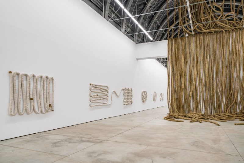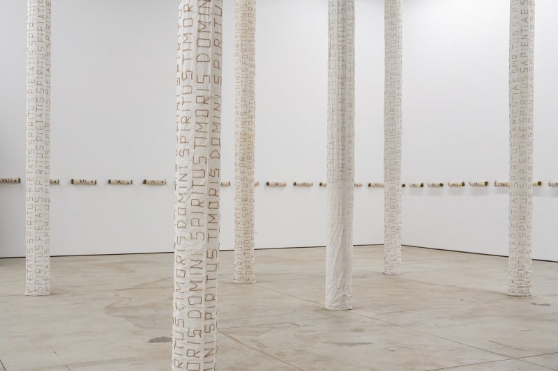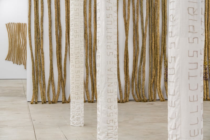 The installation unfolds as a living organism. Towering columns of hay—some over seven meters—rise through the space, acting as conduits of energy, while others are braided into sculptural forms. Herbs release delicate scents; inscribed words echo like mantras. The contrast between the white of handwoven cloth and the darker tones of hay underscores the visual and haptic power of juxtaposed textures and varying thicknesses of weave. Structure, weight, and rhythm emerge from meticulous control of materials, producing a poise and archetypal beauty that govern the space.