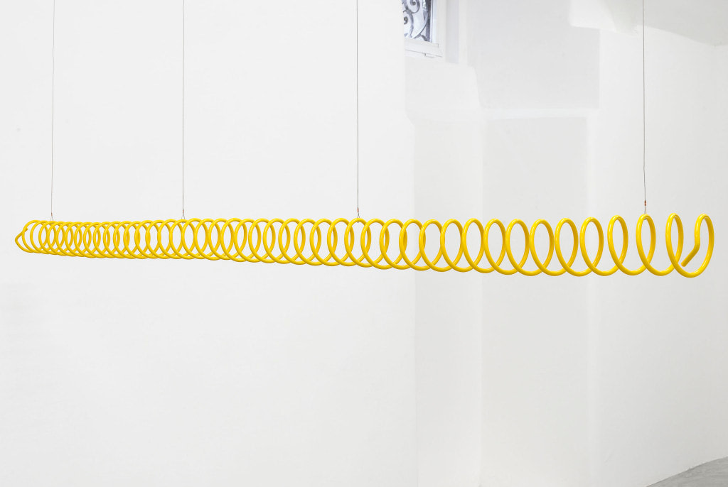 The exhibition title is taken from the short-lived BBC absurdist mockumentary series Look Around You. Squeezing surrealism from subjects as mundane as water and math, the series’ title is also its main behest—a proposition handily taken up, taken apart, and rearranged to poetic ends, displaced yet present.