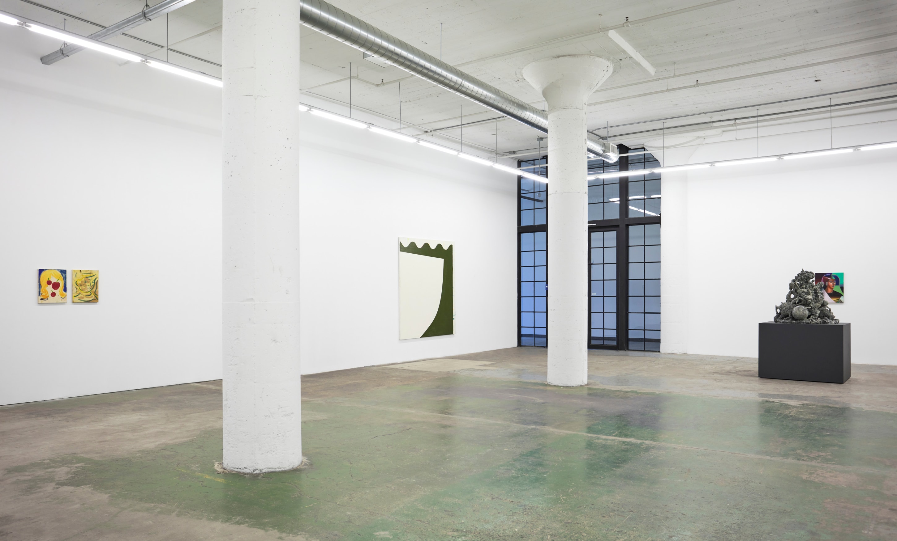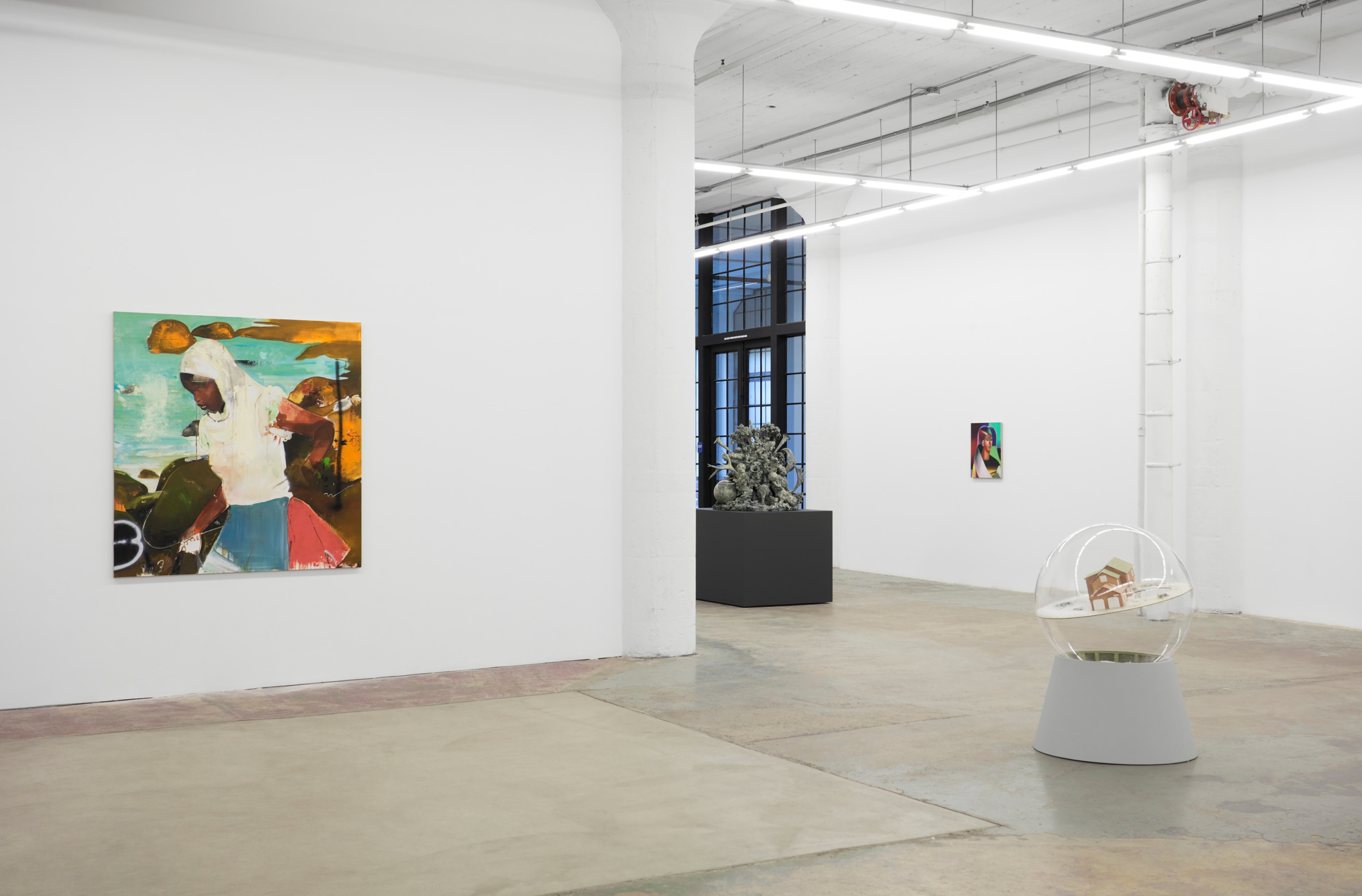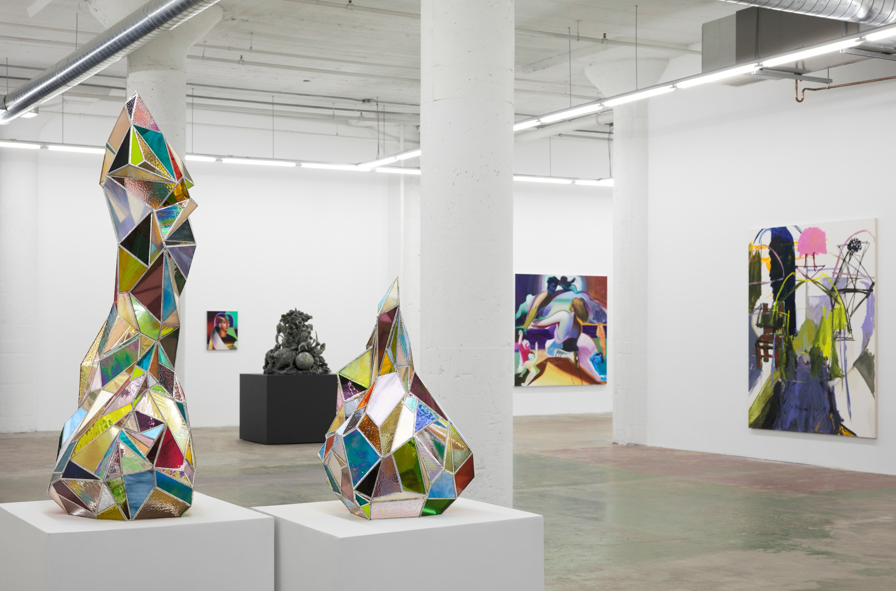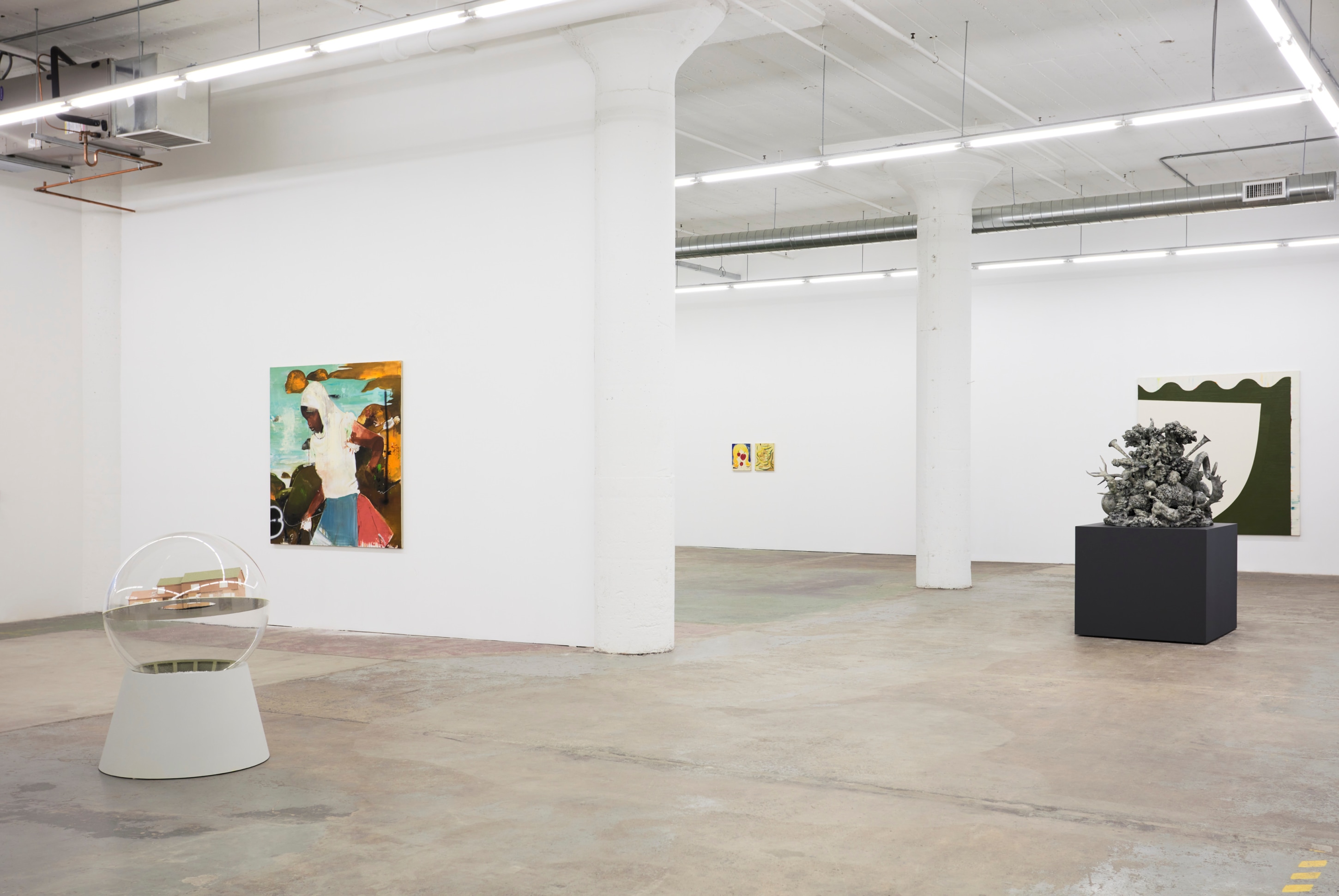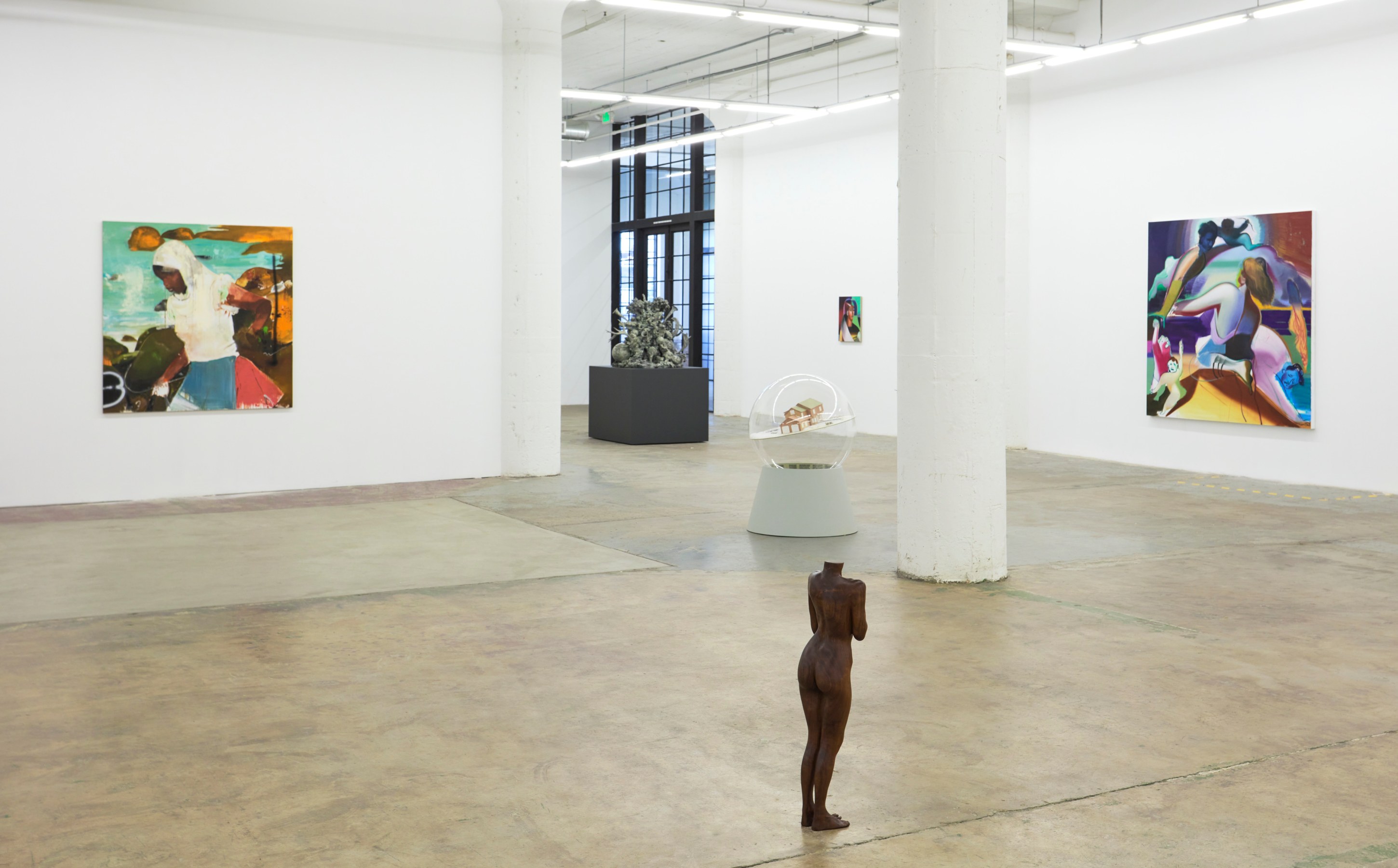 When You Waked Up the Buffalo is a timeline that begins, ends, or in-betweens (depending on when one waked up and which direction she’s walking) with a Big Bang of abstract and emergent figures and forms. Stefania Batoeva’s hard brushstrokes collide into one another and tectonically generate a reclining form upon which what appears to be a chair is seated. Shahla K. Friberg’s stained-glass stalagmites reflect and refract light across the room, alter its form, and toy with its dimensions, while Grant Foster channels Magritte in the feminine abstract. Hugo Wilson’s ethereal bronze stampede springs forth from Shaan Syed’s elegant, layered wave, or perhaps it is summoned by Katherina Olschbaur’s orgy of angels. Wilson’s violent origin story gives way to Olivia Erlanger’s suburbia in a snowglobe, casting the viewer as omnipotent spectator, while Matthias Garcia’s protagonist projects herself back under glass via Facetime.