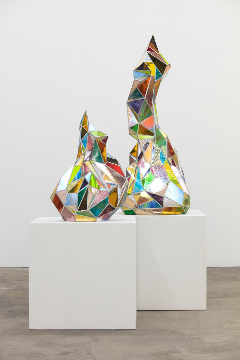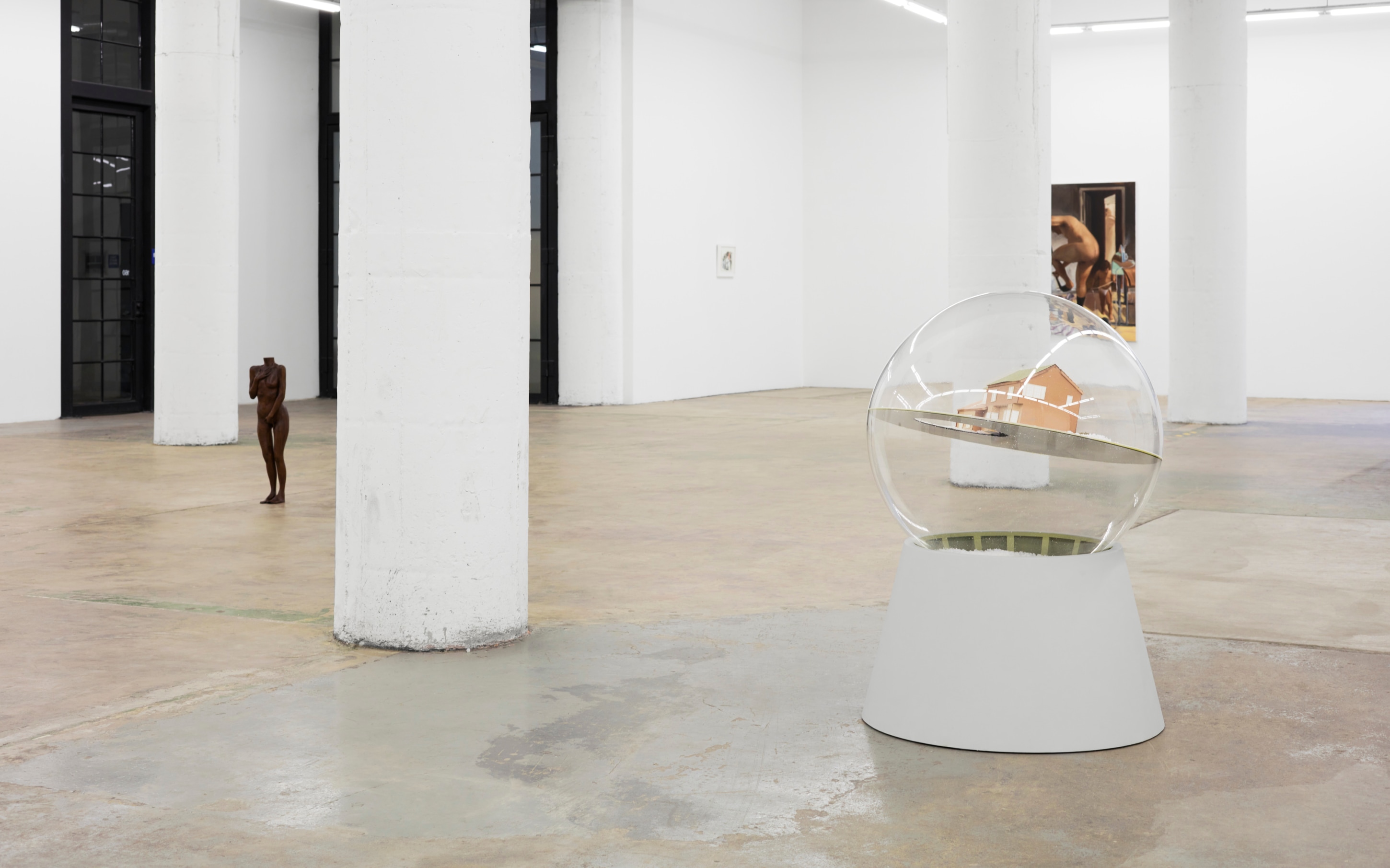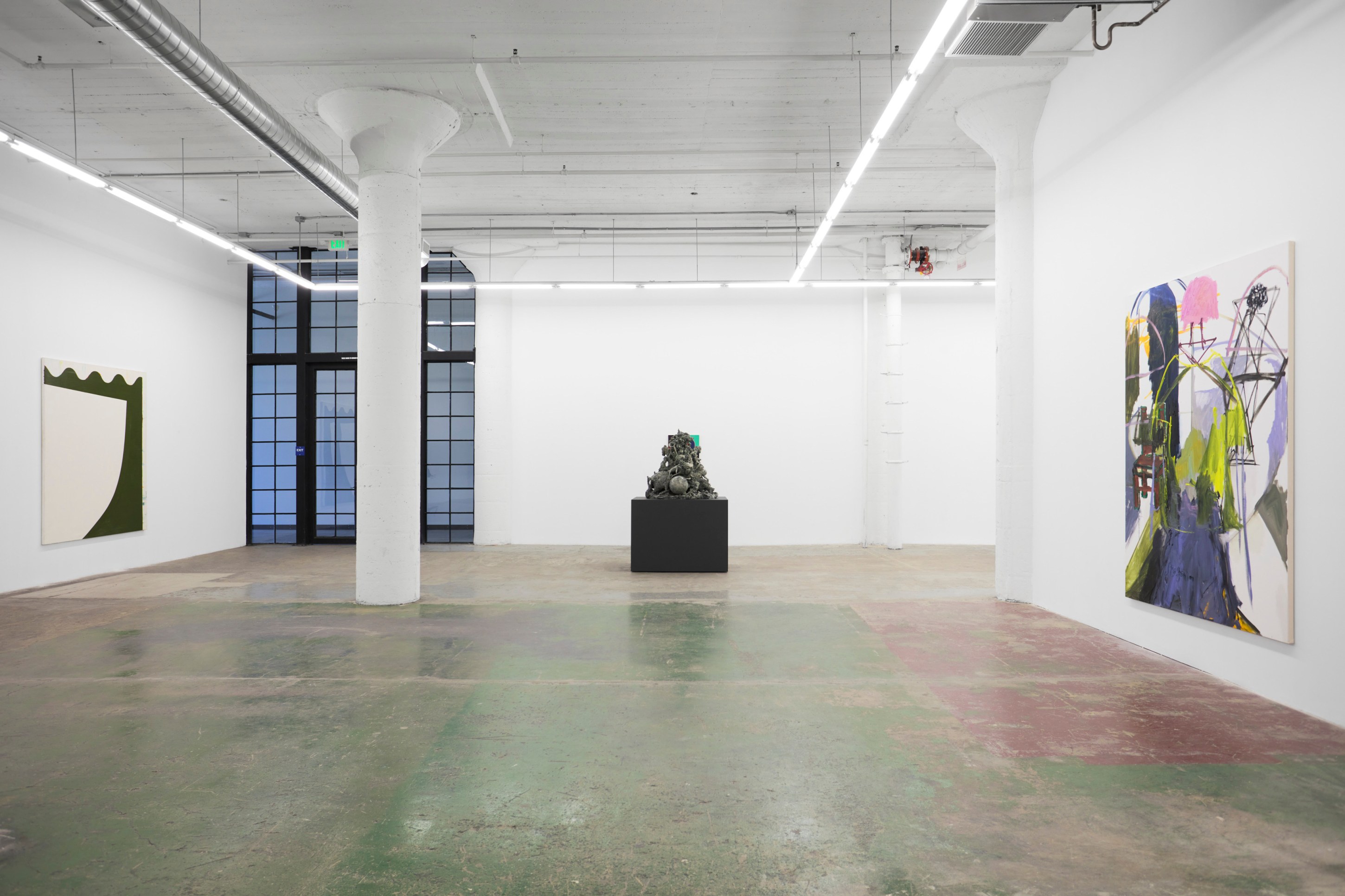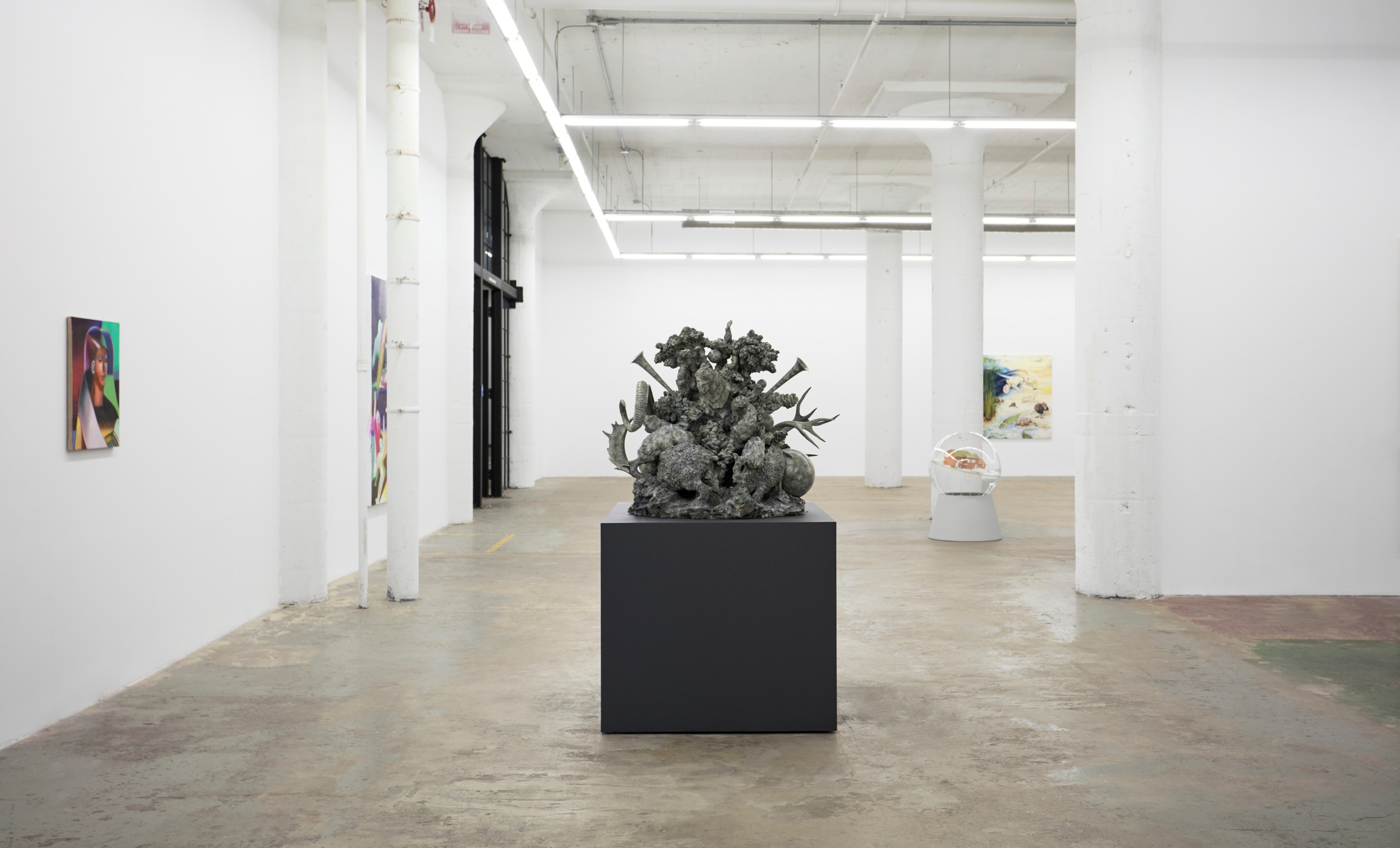 When You Waked Up the Buffalo is a timeline that begins, ends, or in-betweens (depending on when one waked up and which direction she’s walking) with a Big Bang of abstract and emergent figures and forms. Stefania Batoeva’s hard brushstrokes collide into one another and tectonically generate a reclining form upon which what appears to be a chair is seated. Shahla K. Friberg’s stained-glass stalagmites reflect and refract light across the room, alter its form, and toy with its dimensions, while Grant Foster channels Magritte in the feminine abstract. Hugo Wilson’s ethereal bronze stampede springs forth from Shaan Syed’s elegant, layered wave, or perhaps it is summoned by Katherina Olschbaur’s orgy of angels. Wilson’s violent origin story gives way to Olivia Erlanger’s suburbia in a snowglobe, casting the viewer as omnipotent spectator, while Matthias Garcia’s protagonist projects herself back under glass via Facetime.