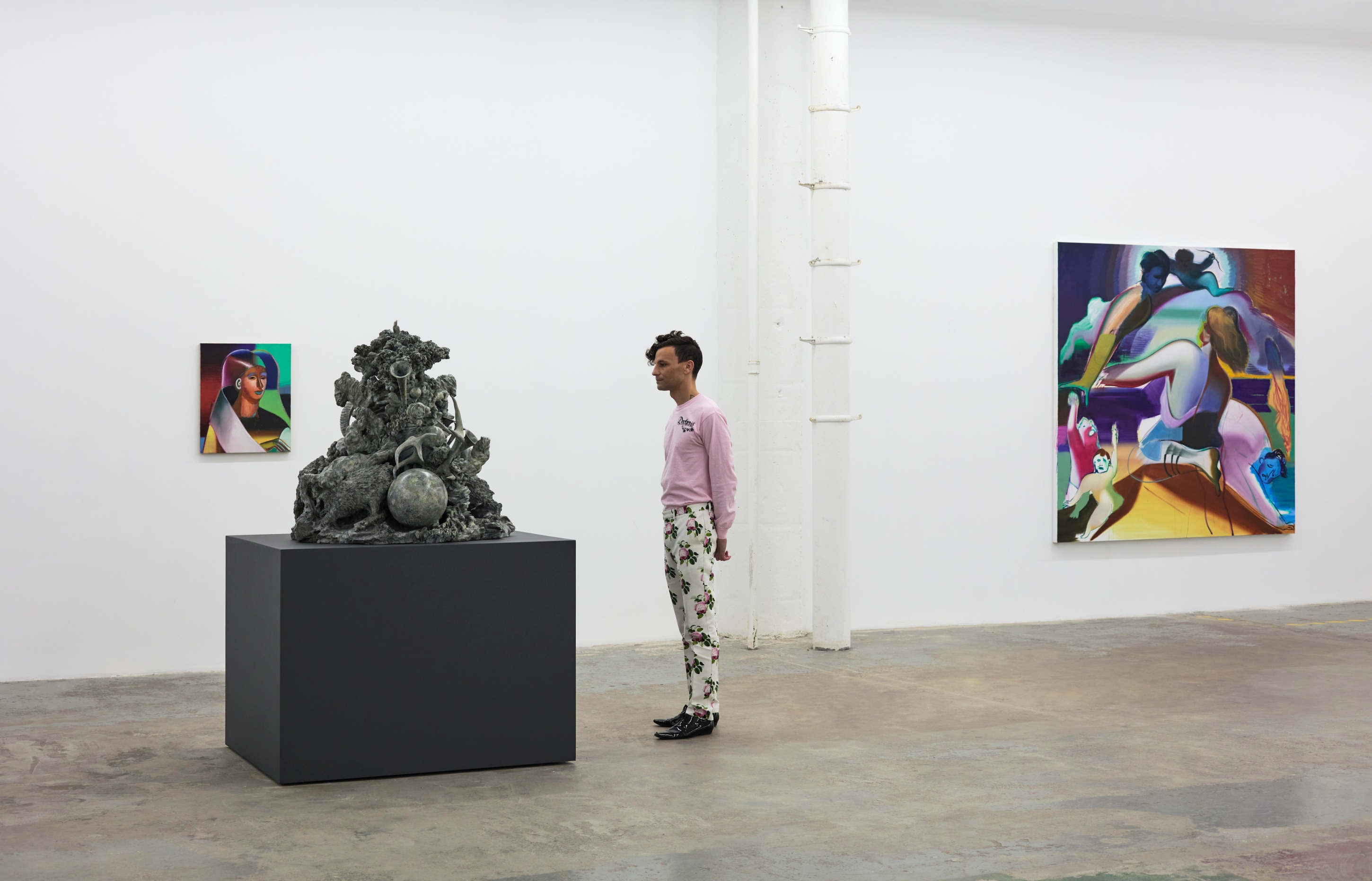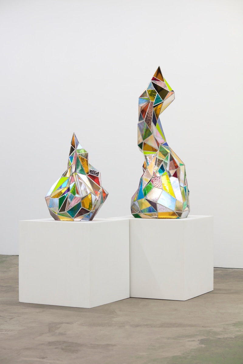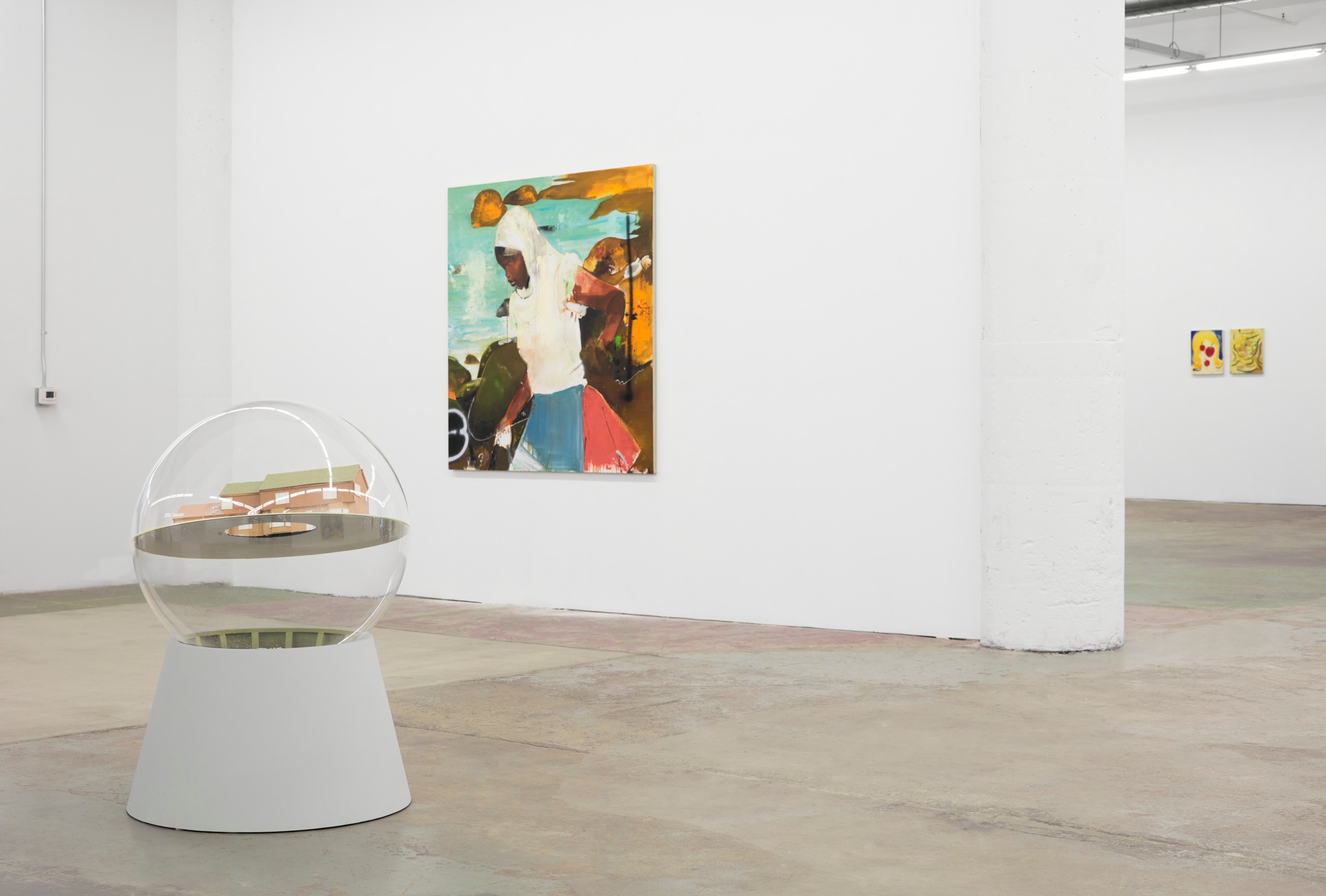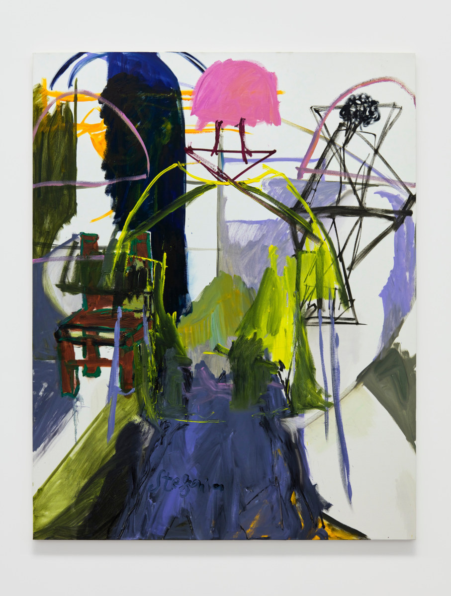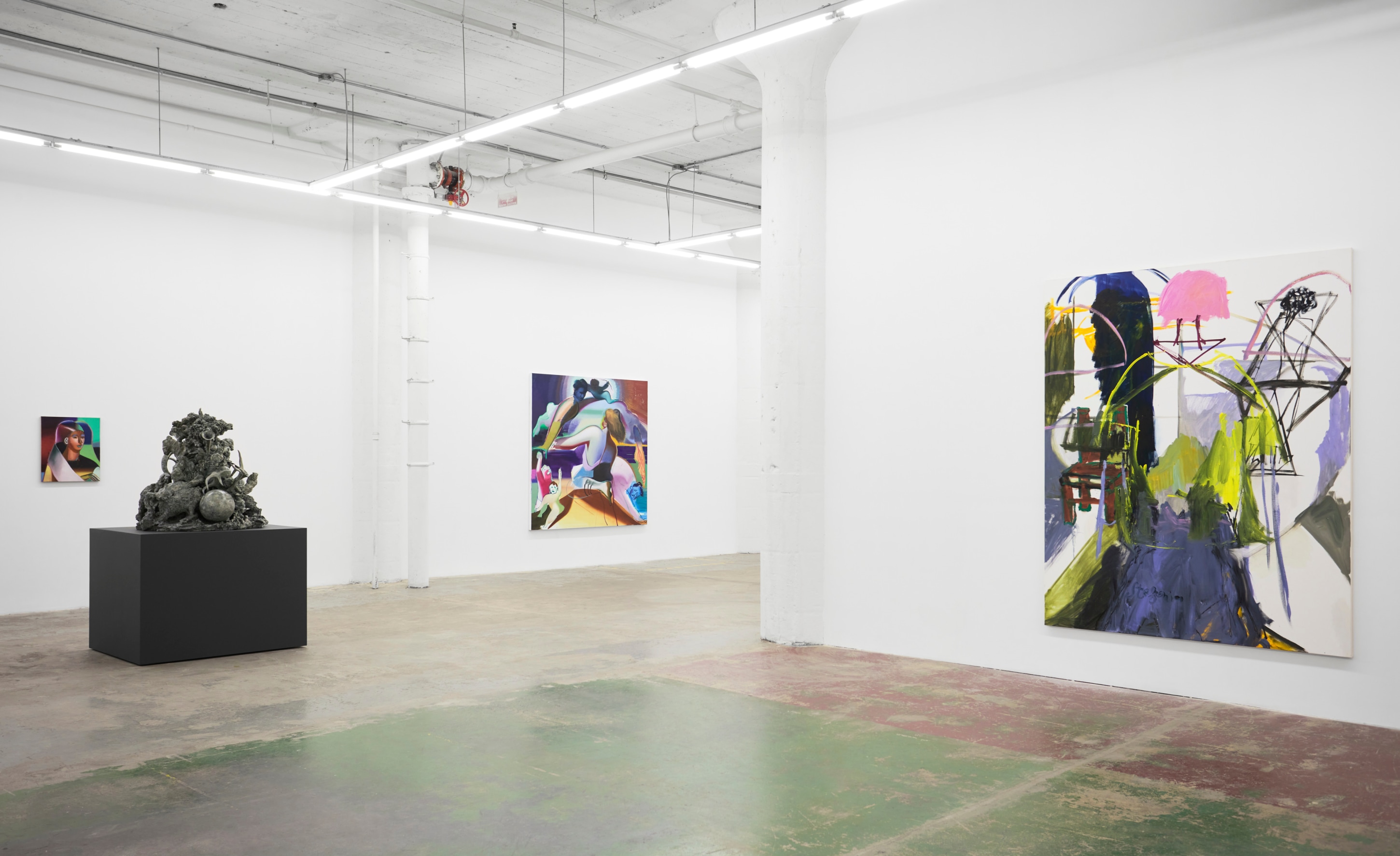 When You Waked Up the Buffalo is a timeline that begins, ends, or in-betweens (depending on when one waked up and which direction she’s walking) with a Big Bang of abstract and emergent figures and forms. Stefania Batoeva’s hard brushstrokes collide into one another and tectonically generate a reclining form upon which what appears to be a chair is seated. Shahla K. Friberg’s stained-glass stalagmites reflect and refract light across the room, alter its form, and toy with its dimensions, while Grant Foster channels Magritte in the feminine abstract. Hugo Wilson’s ethereal bronze stampede springs forth from Shaan Syed’s elegant, layered wave, or perhaps it is summoned by Katherina Olschbaur’s orgy of angels. Wilson’s violent origin story gives way to Olivia Erlanger’s suburbia in a snowglobe, casting the viewer as omnipotent spectator, while Matthias Garcia’s protagonist projects herself back under glass via Facetime.