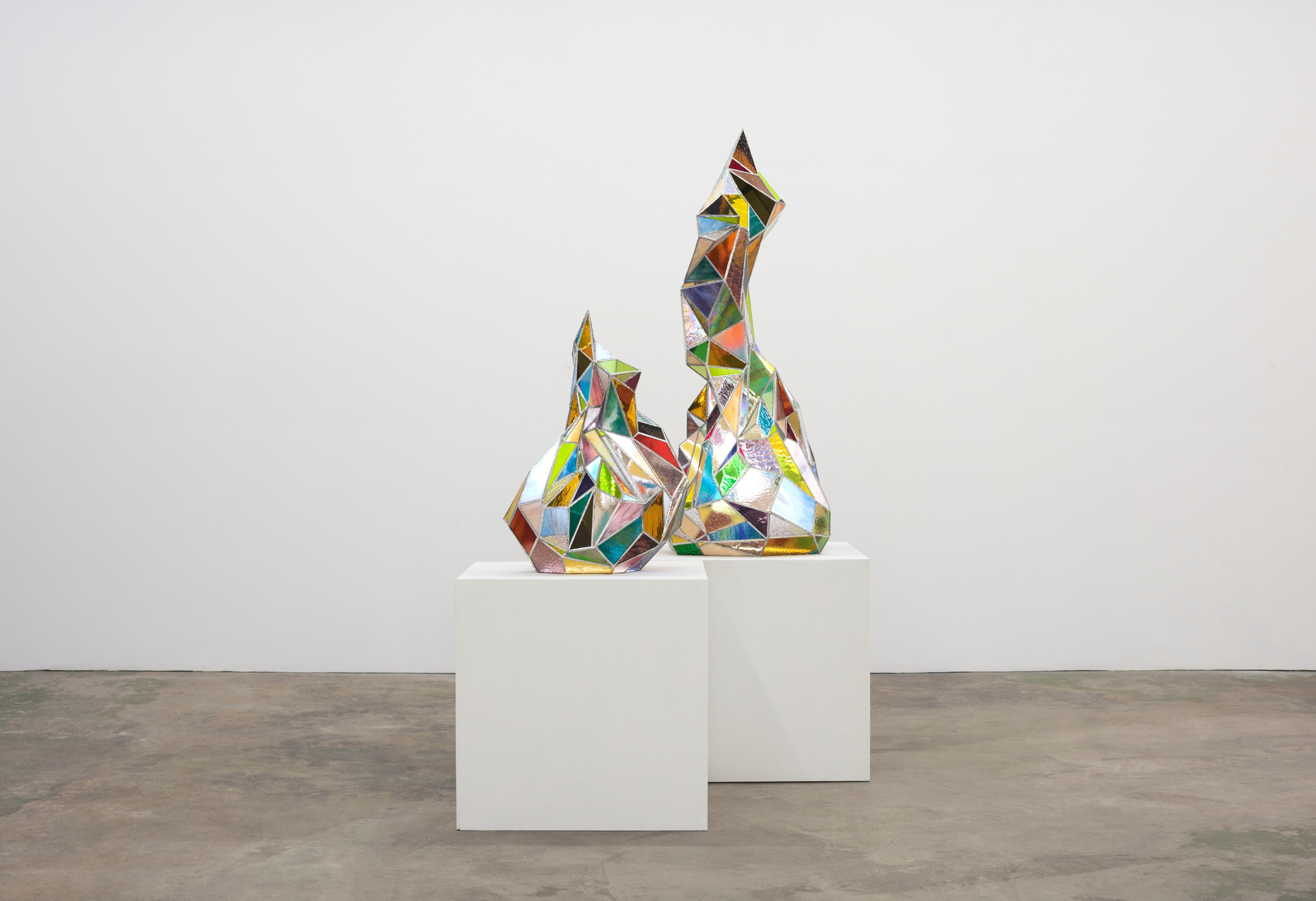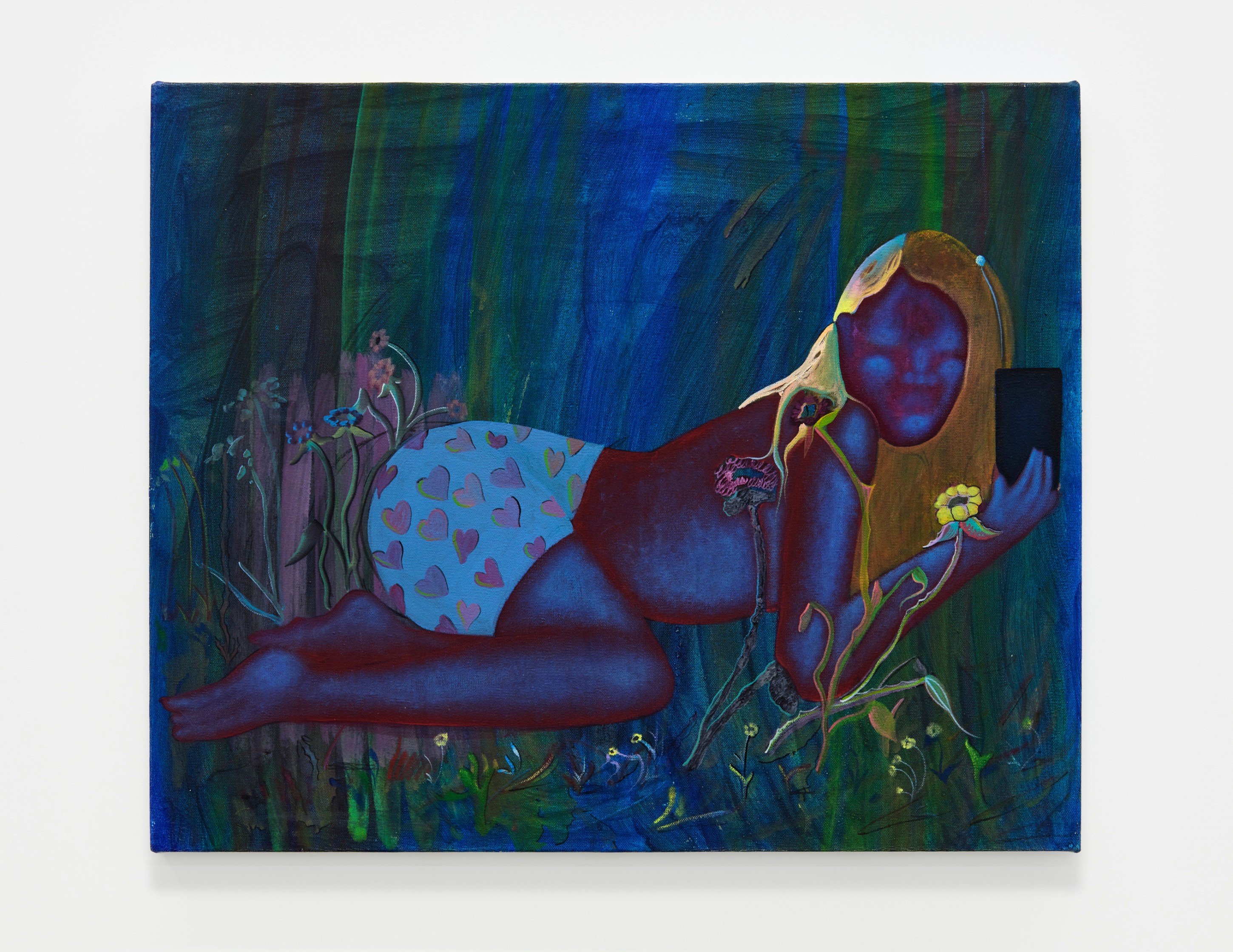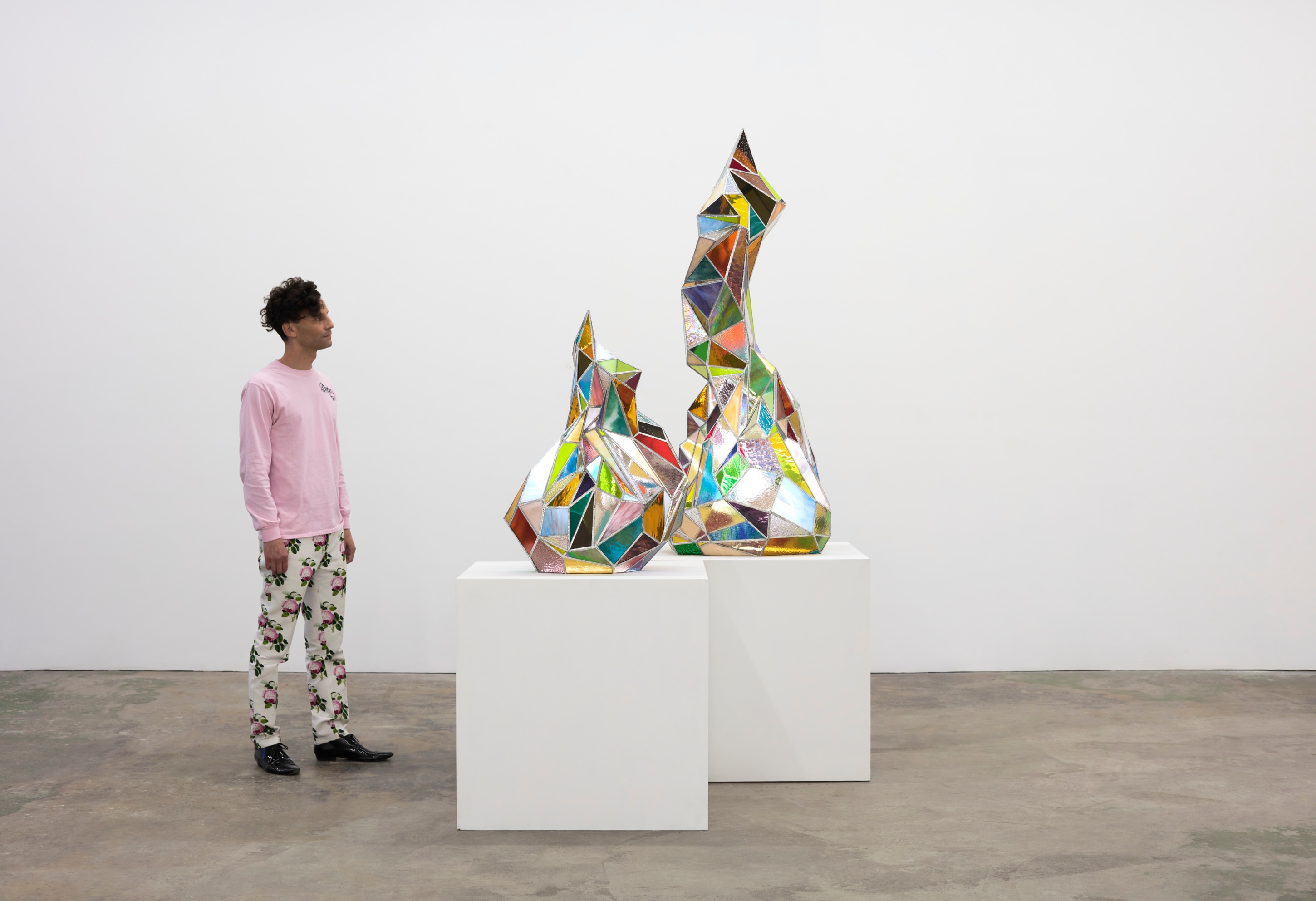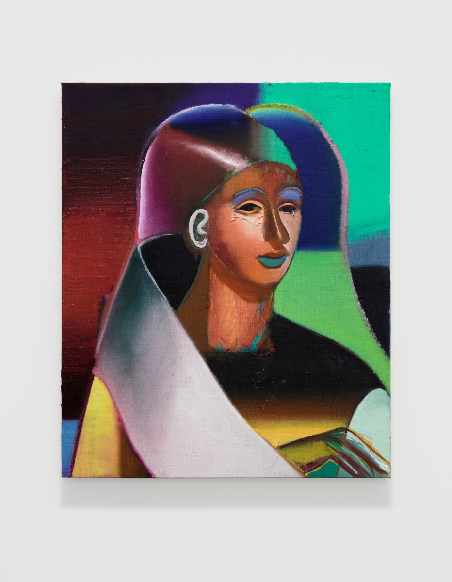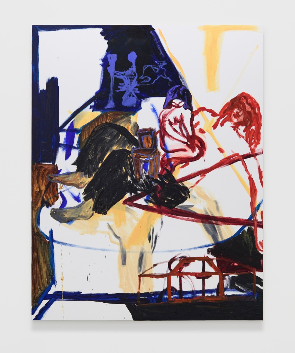 When You Waked Up the Buffalo is a timeline that begins, ends, or in-betweens (depending on when one waked up and which direction she’s walking) with a Big Bang of abstract and emergent figures and forms. Stefania Batoeva’s hard brushstrokes collide into one another and tectonically generate a reclining form upon which what appears to be a chair is seated. Shahla K. Friberg’s stained-glass stalagmites reflect and refract light across the room, alter its form, and toy with its dimensions, while Grant Foster channels Magritte in the feminine abstract. Hugo Wilson’s ethereal bronze stampede springs forth from Shaan Syed’s elegant, layered wave, or perhaps it is summoned by Katherina Olschbaur’s orgy of angels. Wilson’s violent origin story gives way to Olivia Erlanger’s suburbia in a snowglobe, casting the viewer as omnipotent spectator, while Matthias Garcia’s protagonist projects herself back under glass via Facetime.