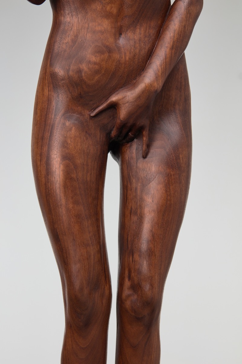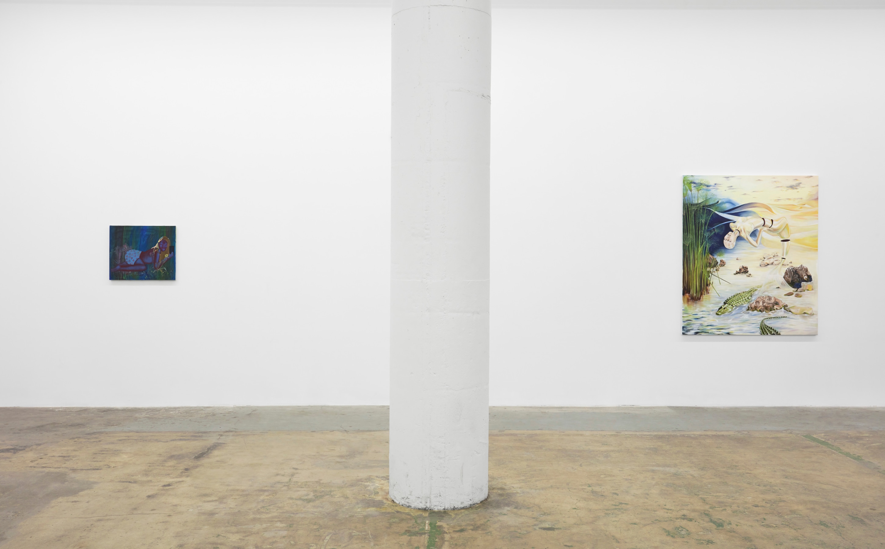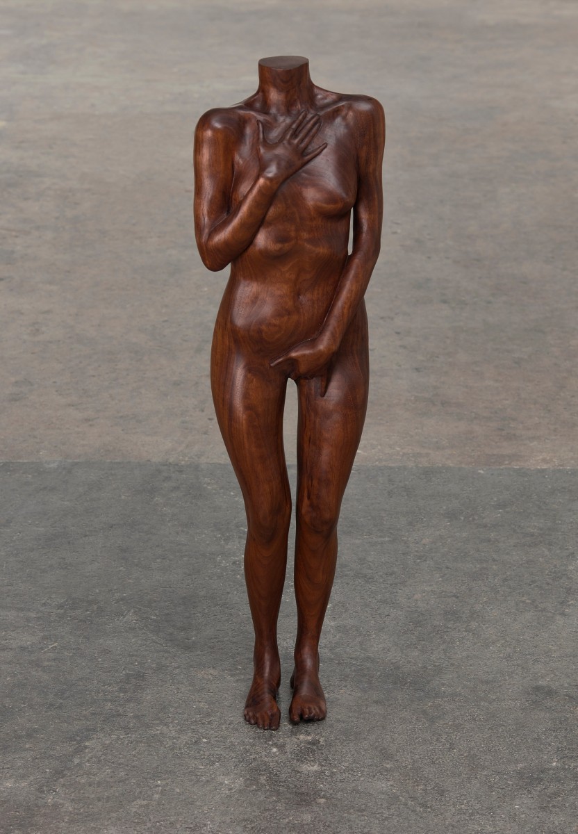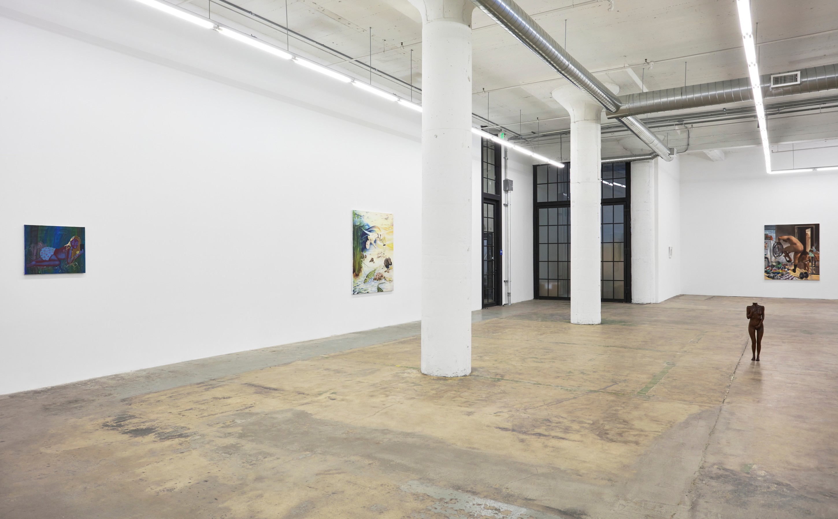 The figures are full now, their bodies tangible: a loosely-rendered woman carefully toes the line of her existence on an oceanfront in Devin B. Johnson’s stitched-together linen surface; Isabelle Albuquerque’s headless, solid walnut form calls to mind ancient Grecian relics, or represents a manual for a more practical scale of human; Nicolette Mishkan’s levitating mermaid pulls her severed body together from an impossible desert swamp.