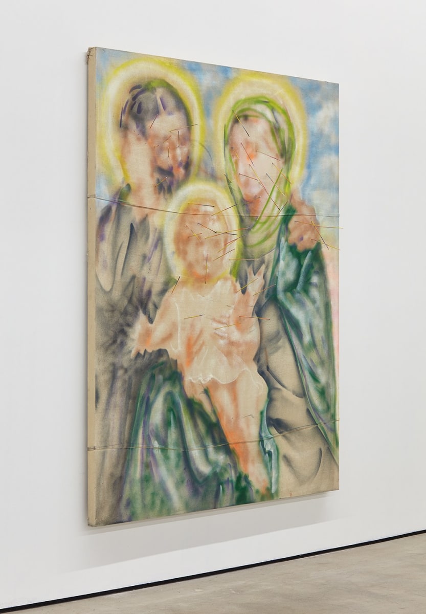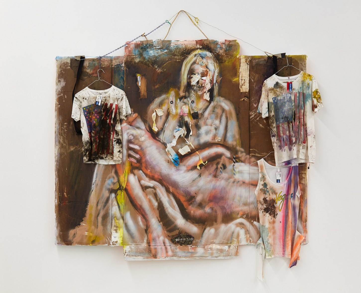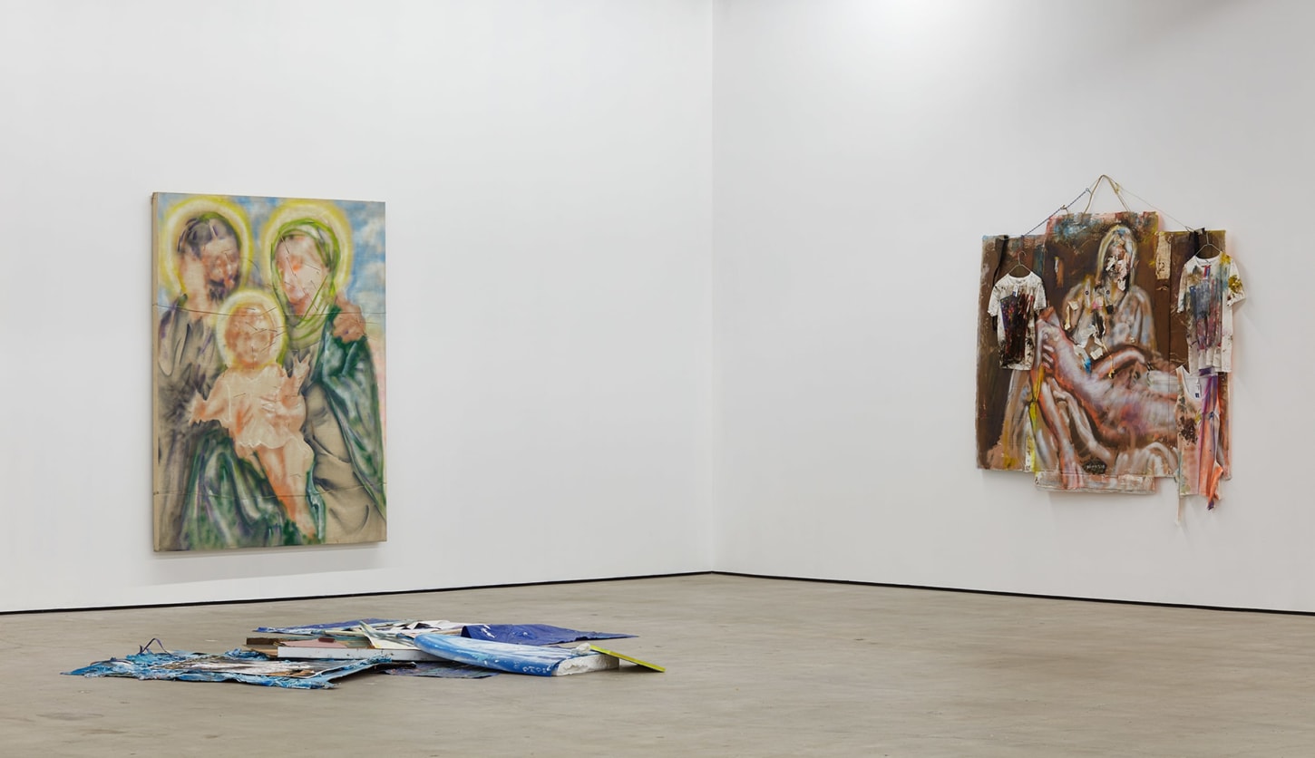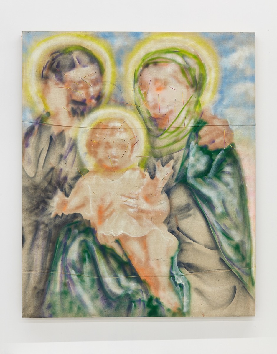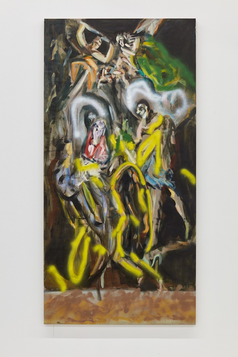 juxtapositions of kitsch imagery, coded narratives, contingency and contradiction between the visual elements to emanate. At the same time, these very devices eliminate the artist’s predetermined possible significance and instead evoke variable readings from various viewers. He reworks the classical and the kitschy at the same time with a listless attitude, so that everything, instead of creating new meanings, works to disrupt and undo one and other on the pictorial surface. His paintings empower the viewer with a sense of freedom not to believe certain things—especially the goodness in art—and a sensation of transgression.