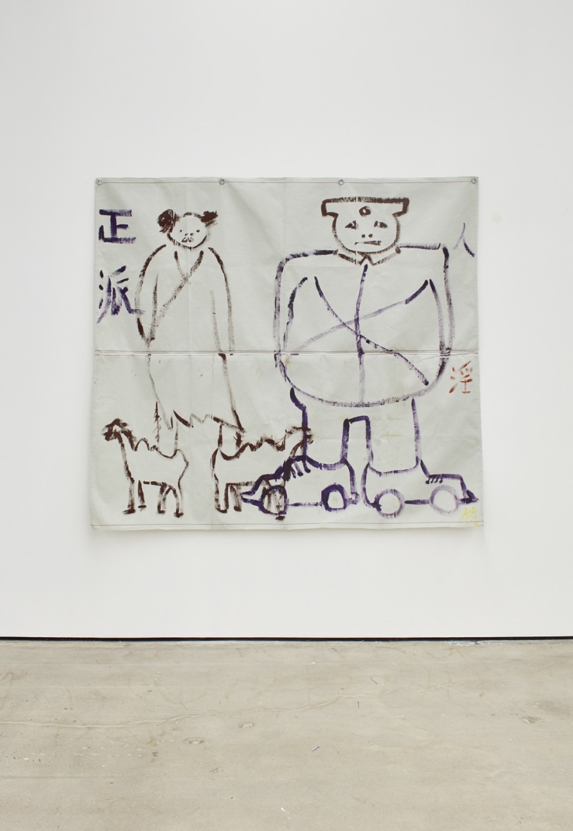 Flat, immediate, reductive, and lineate, Liao’s painting reveals his profound interest in the fluidity between painting, drawing, and calligraphy—a sensibility rooted outside Renaissance traditions. Liao handles canvas like paper. Instead stretching the canvas, he affixes it directly on the wall. The image is always depicted with a few crude but expressive strokes, and the background is left largely blank or with a quick wash of color. His paintings entertain the viewer with grotesque worlds and fantastical scenes in which the caricatures are subject to ridicules or even humiliations. He often inscribes the narration, the title, and his name on the painting, which alludes to not only the distinctive interplay between text and image in Chinese Literati painting but also in comic strips and street graffiti. While the subjects in his idiosyncratic paintings appear easy to decipher at the first glance, the unspoken allusions are often known only to Liao himself.